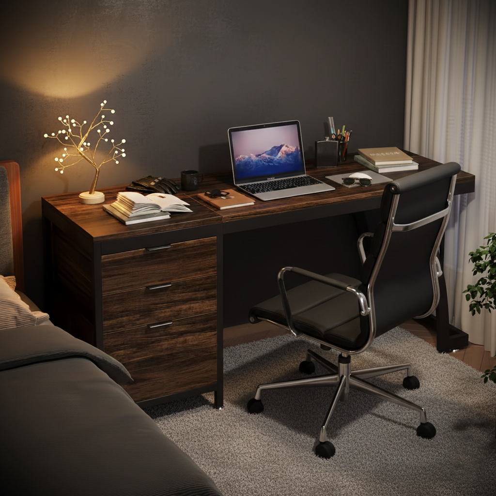 Whether placed in a dedicated office or a bedroom corner, the desk stands firm on hardwood, laminate, tile, and low-pile carpet, keeping your setup stable and consistent.