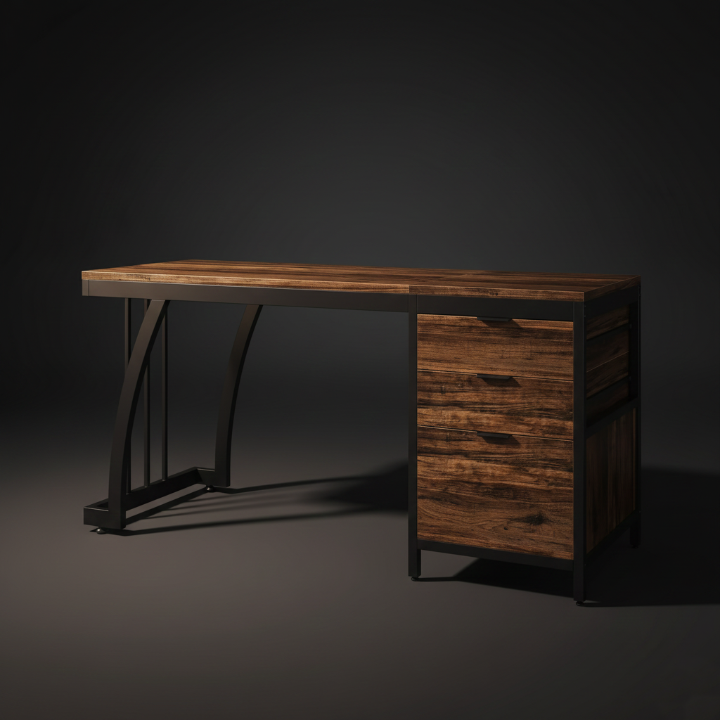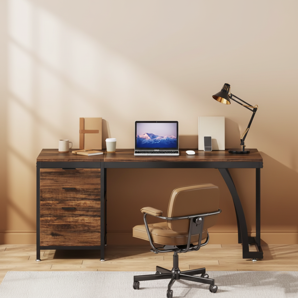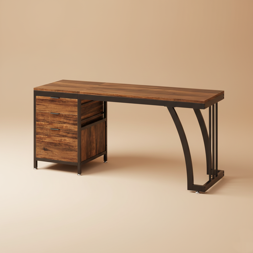 A premium 59-inch workstation built for focus and organization. It features a solid metal frame, a wide wood surface for dual monitors, and a modular drawer unit you can position on either side. Smooth edges, stable footing, and three integrated drawers keep your setup clean, functional, and ready for deep work.