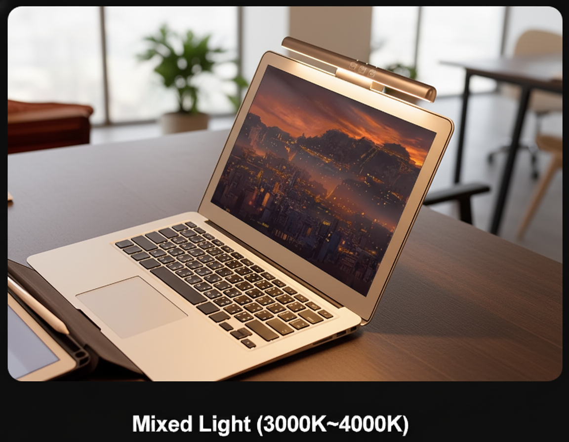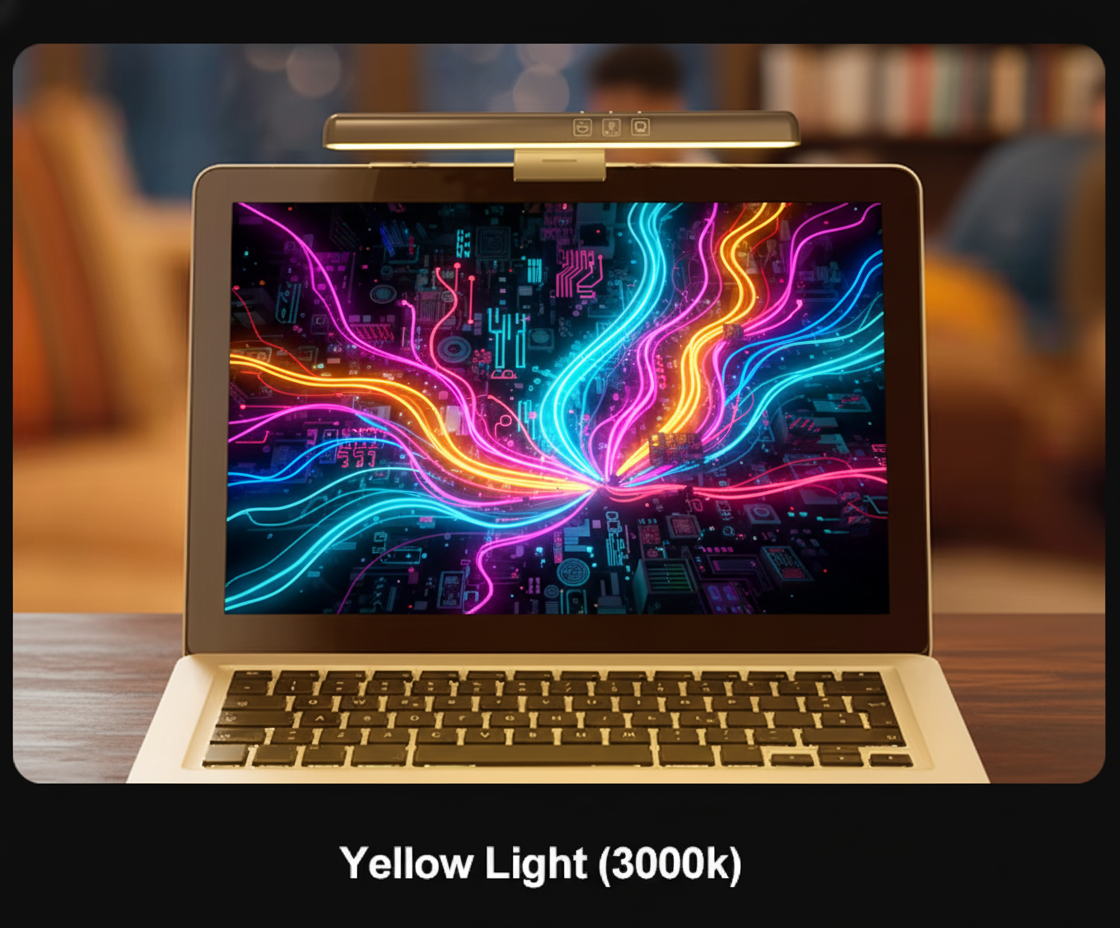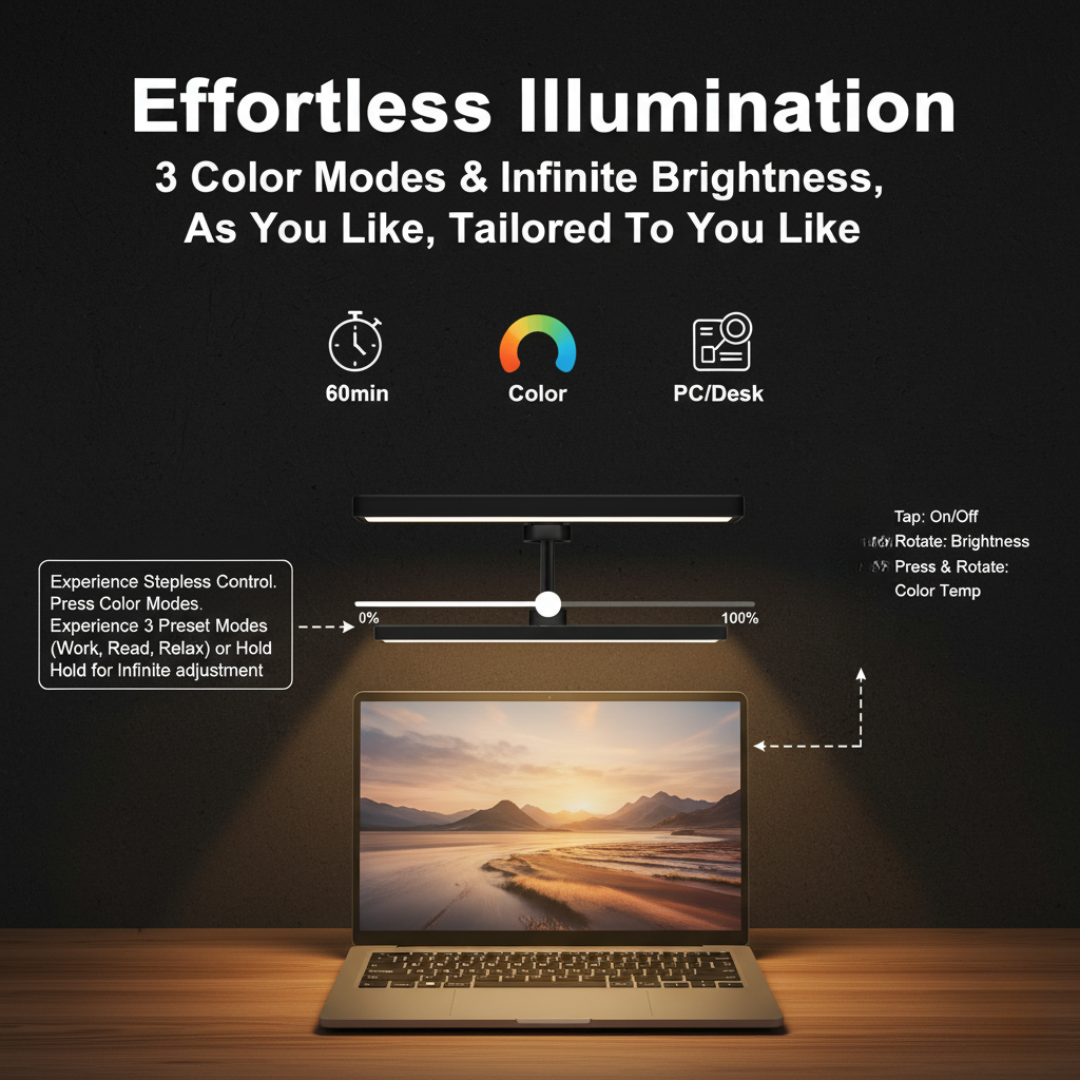 The light uses an asymmetric optical design that directs illumination forward onto your workspace, not toward your display. This prevents reflections, eliminates glare, and keeps your screen perfectly clear whether you’re working, gaming, or reading. -